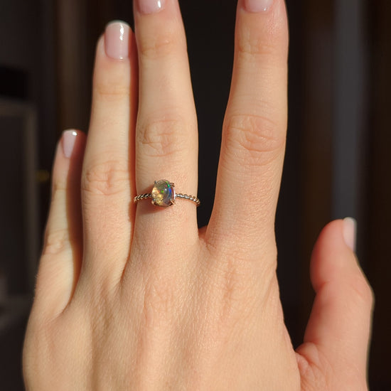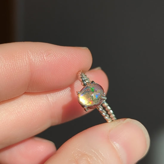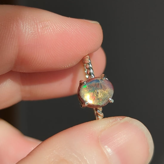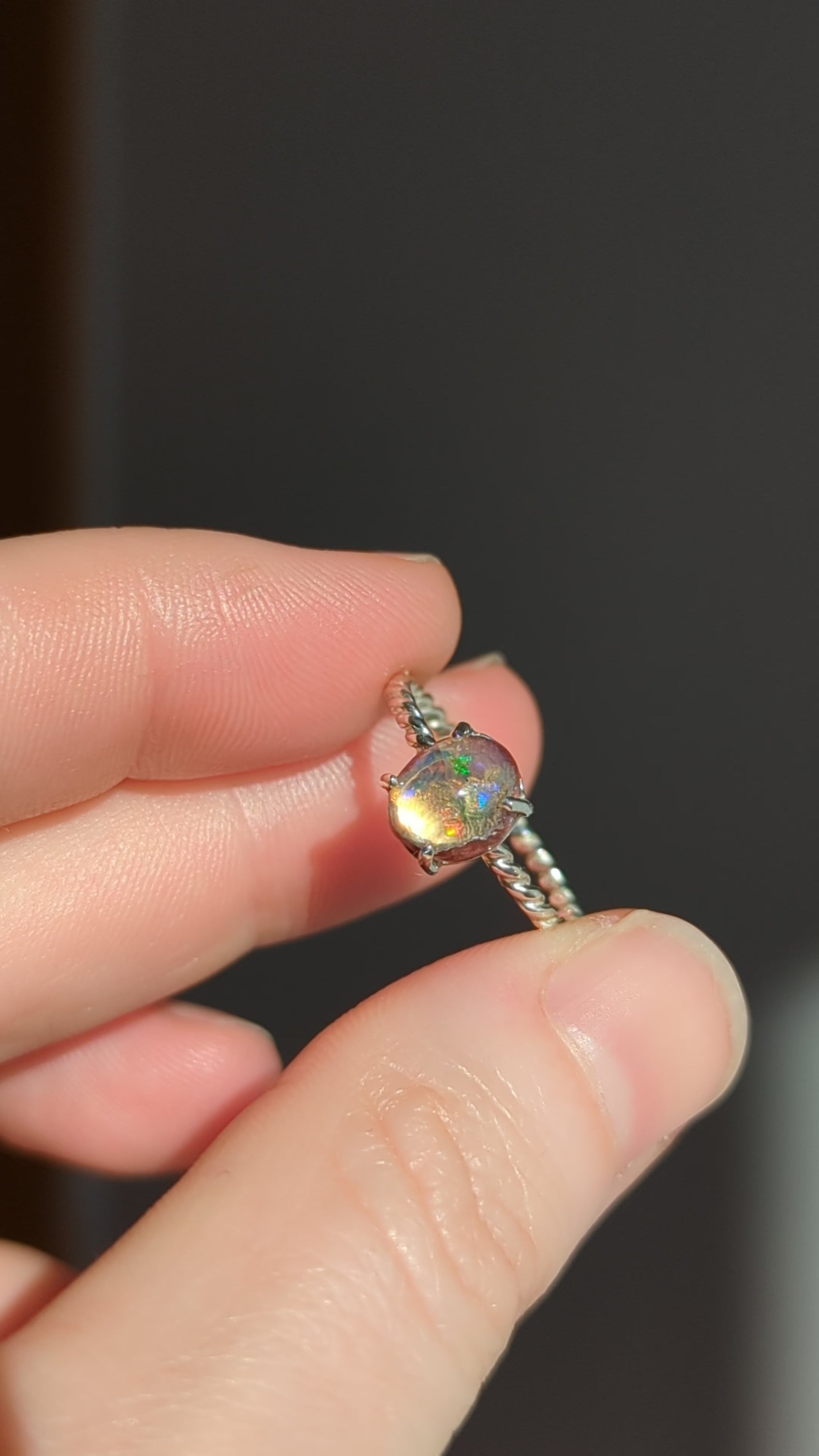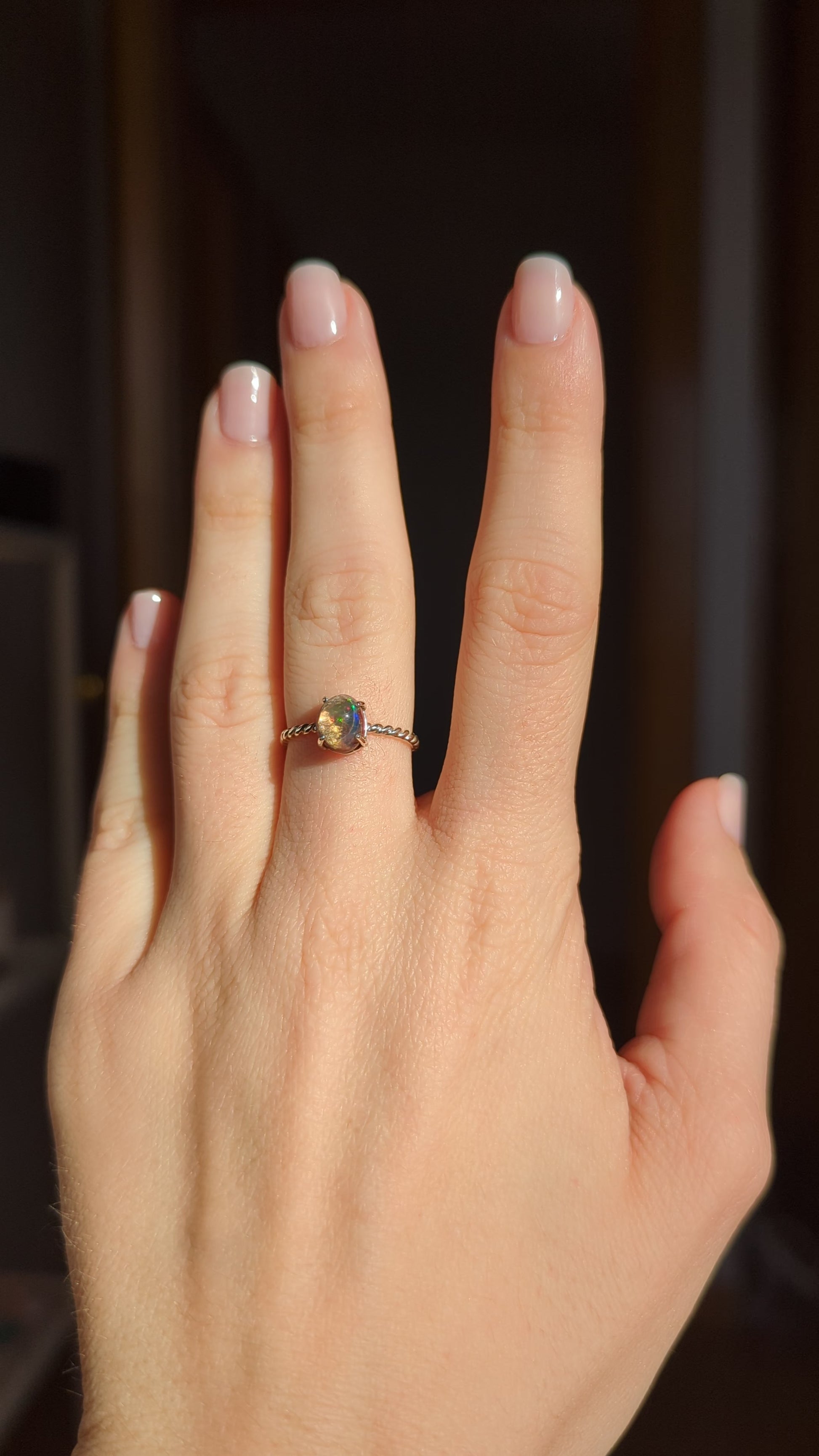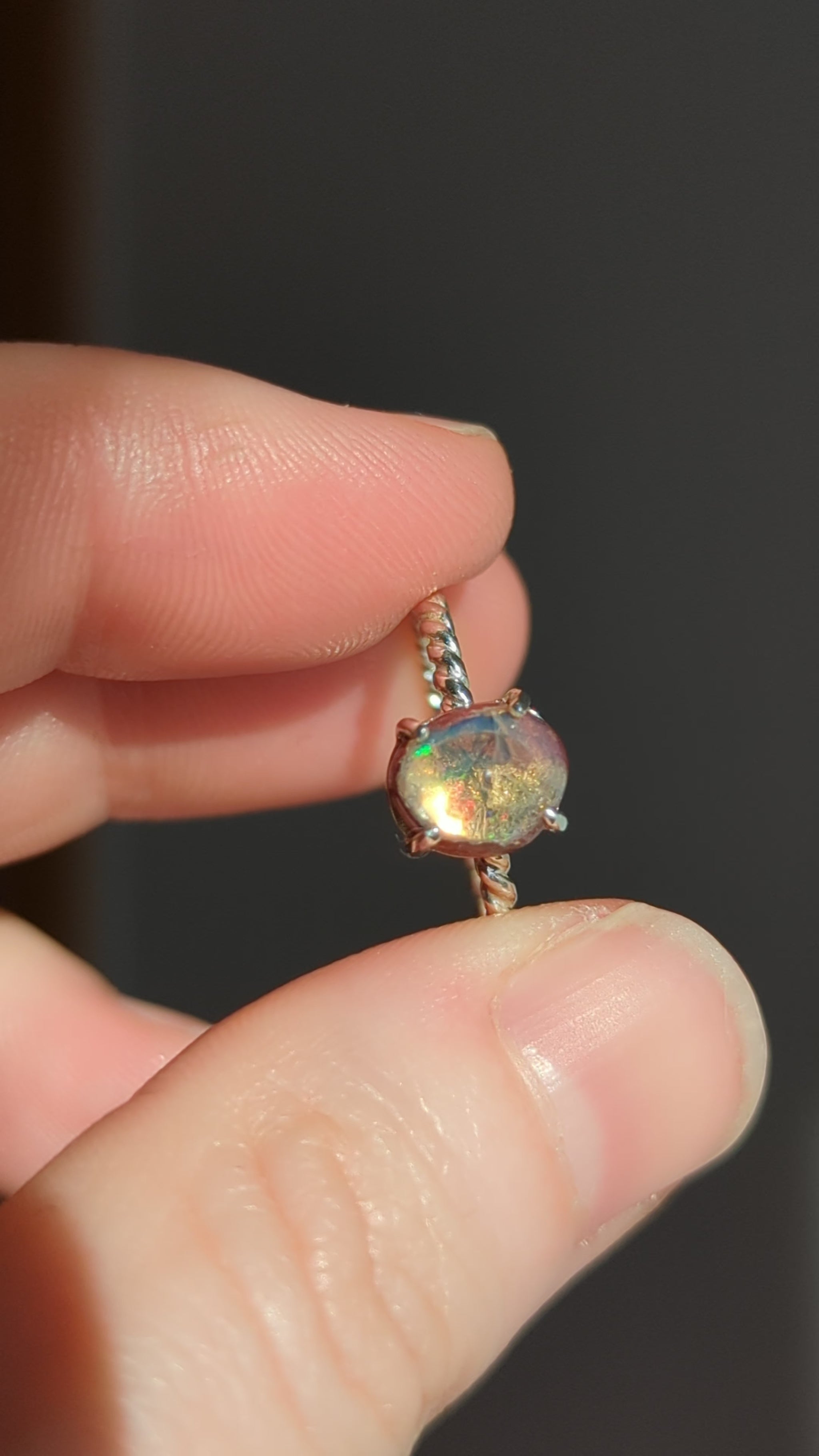 Este anillo lleva un maravilloso ópalo mexicano y está hecho de plata de ley. Es prácticamente todo ópalo y eso hace que parezca una gota de agua.
