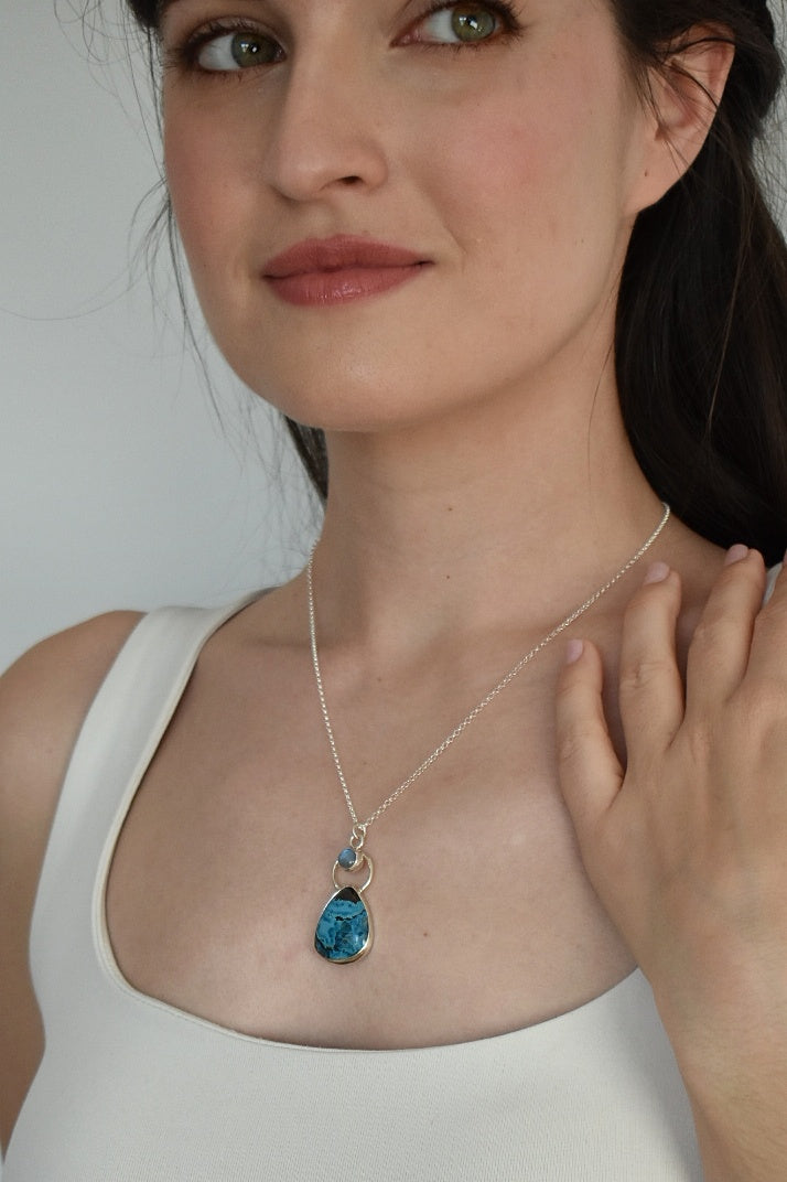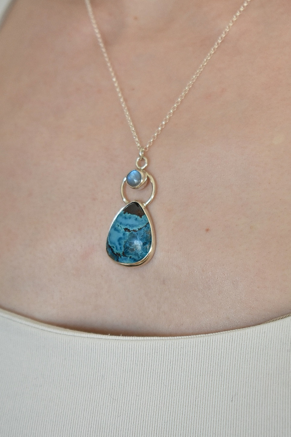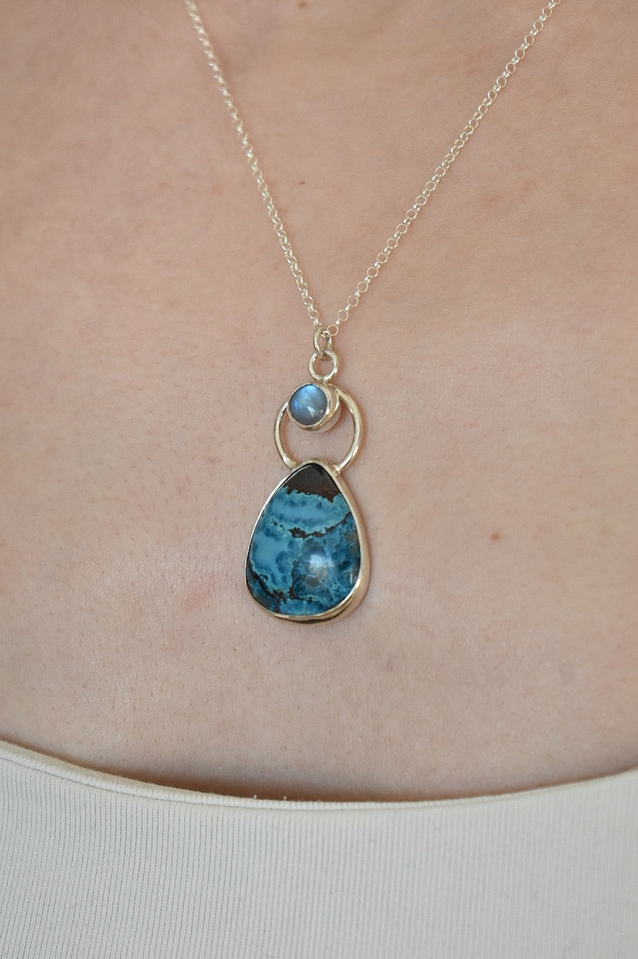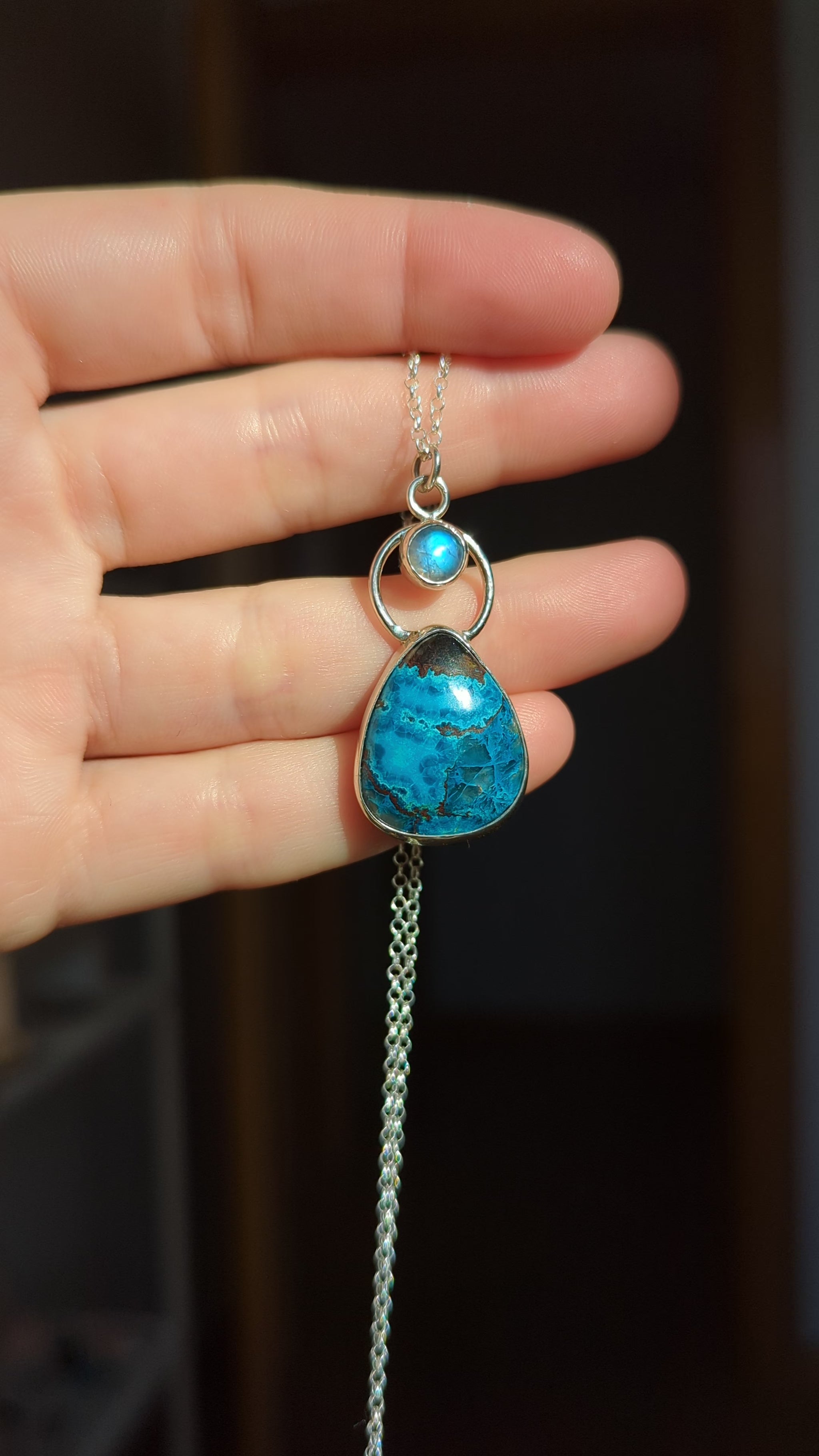 Este colgante está hecho con plata de ley y dos piedras, una shattukita increíble y una piedra luna.