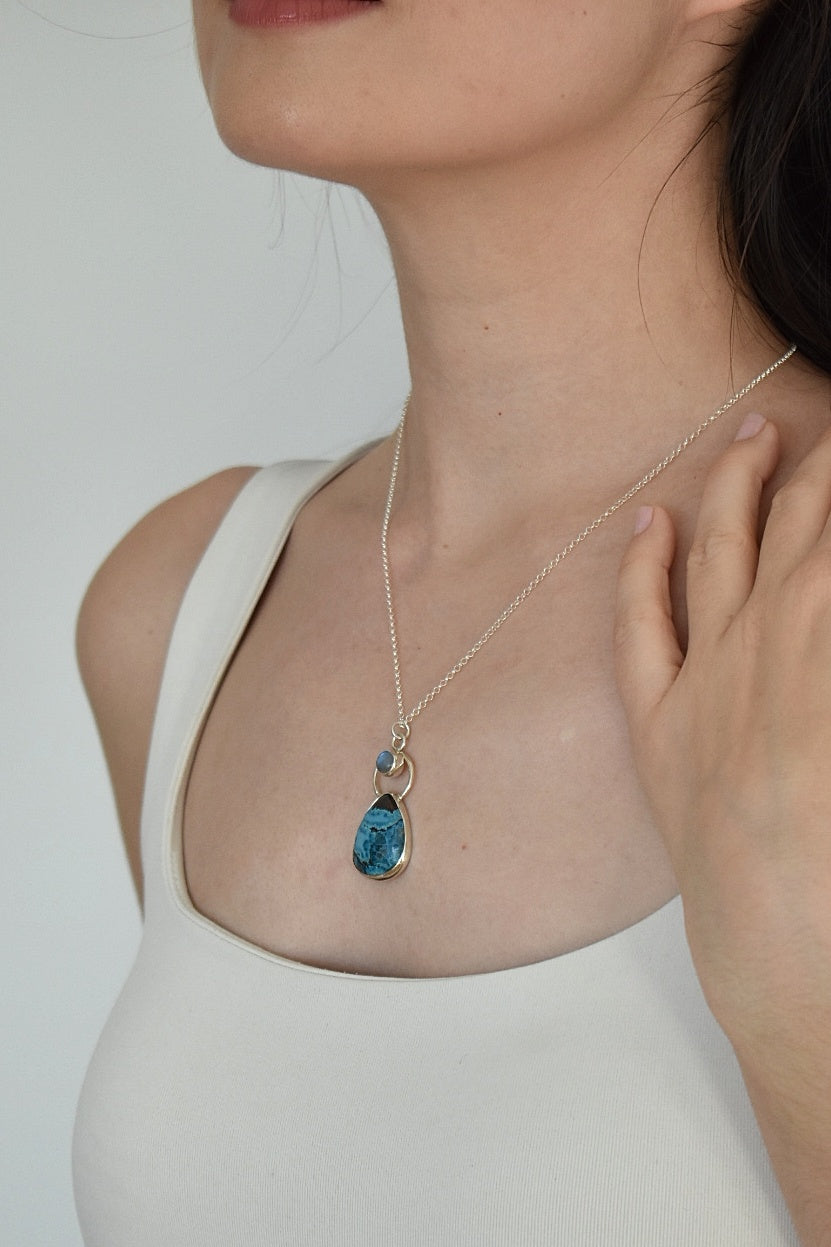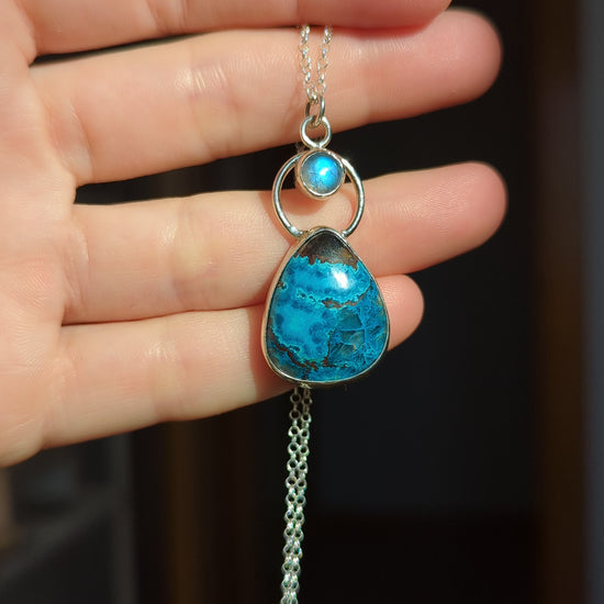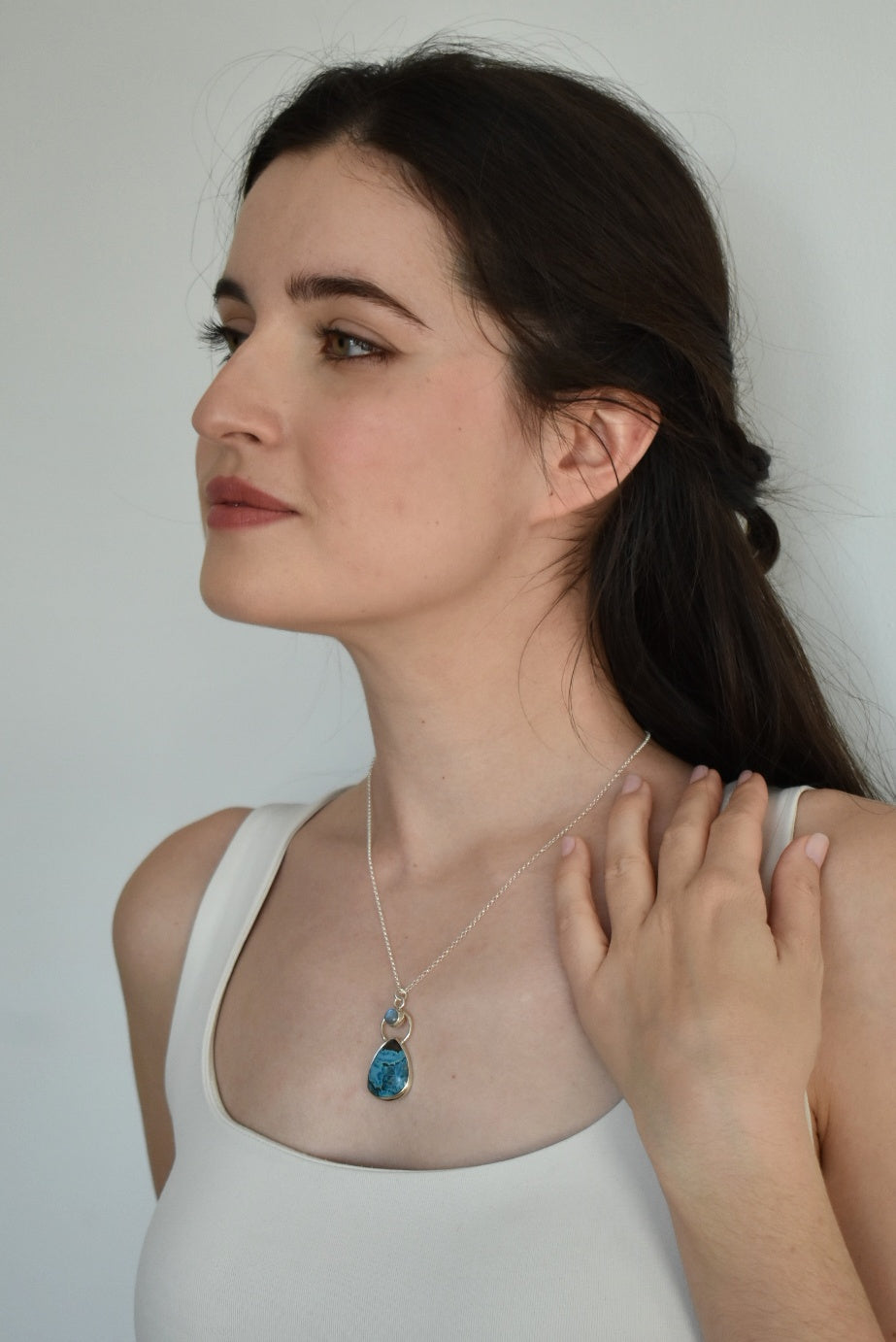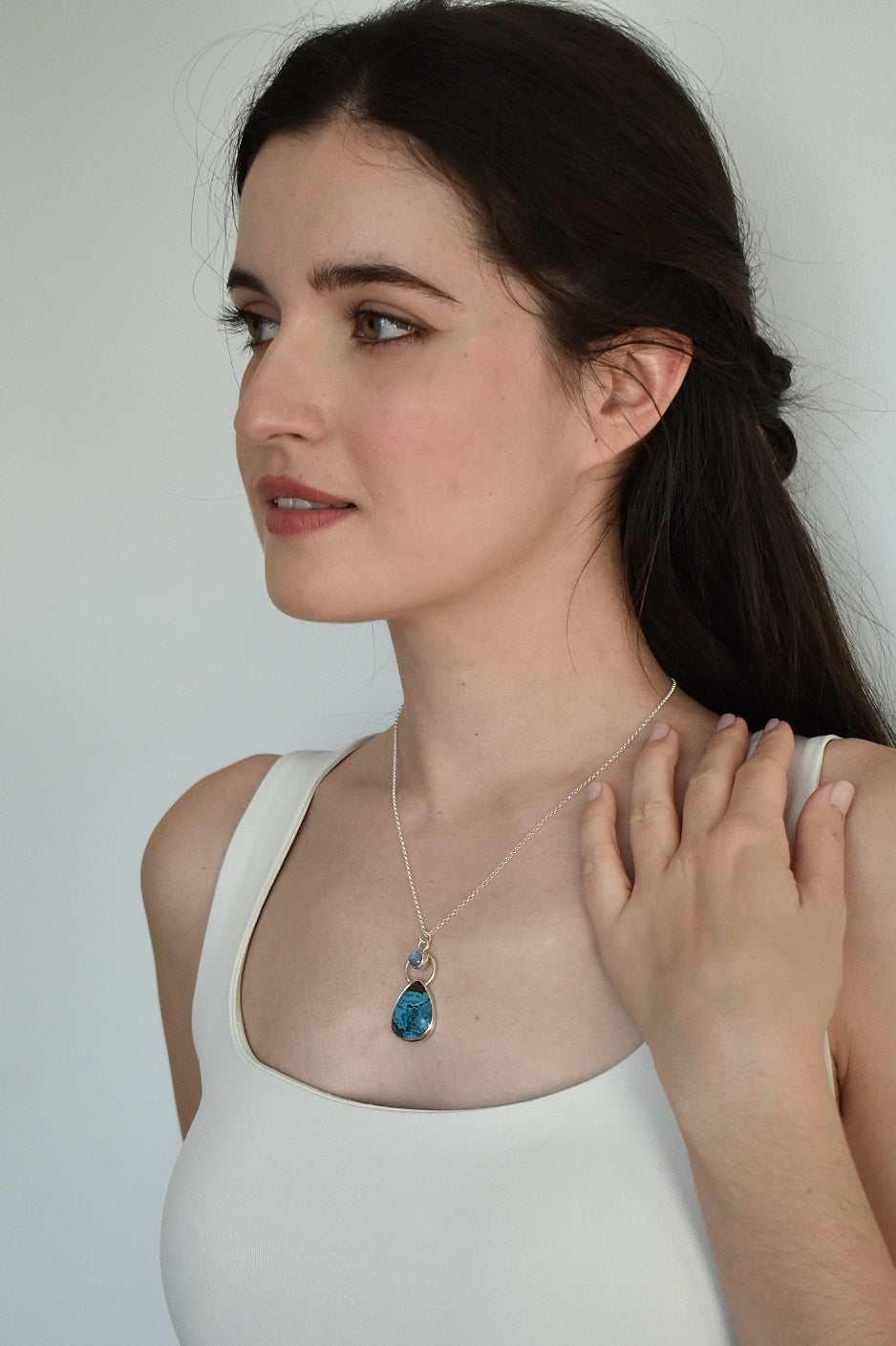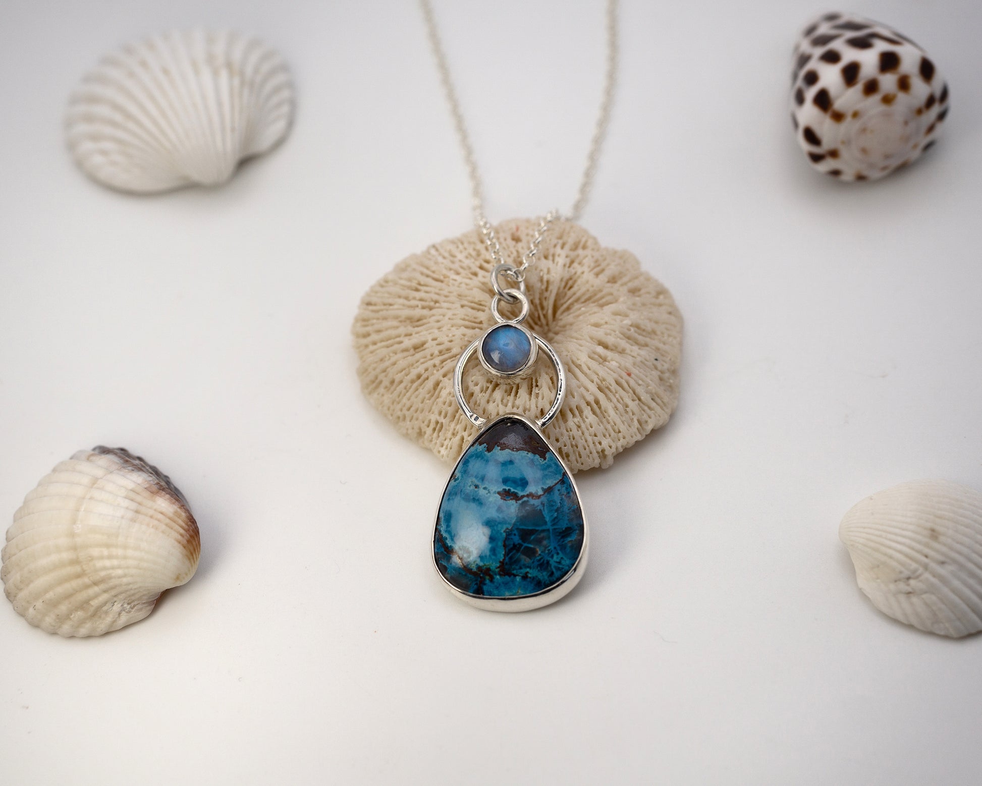 Este colgante está hecho con plata de ley y dos piedras, una shattukita increíble y una piedra luna.