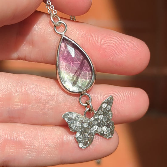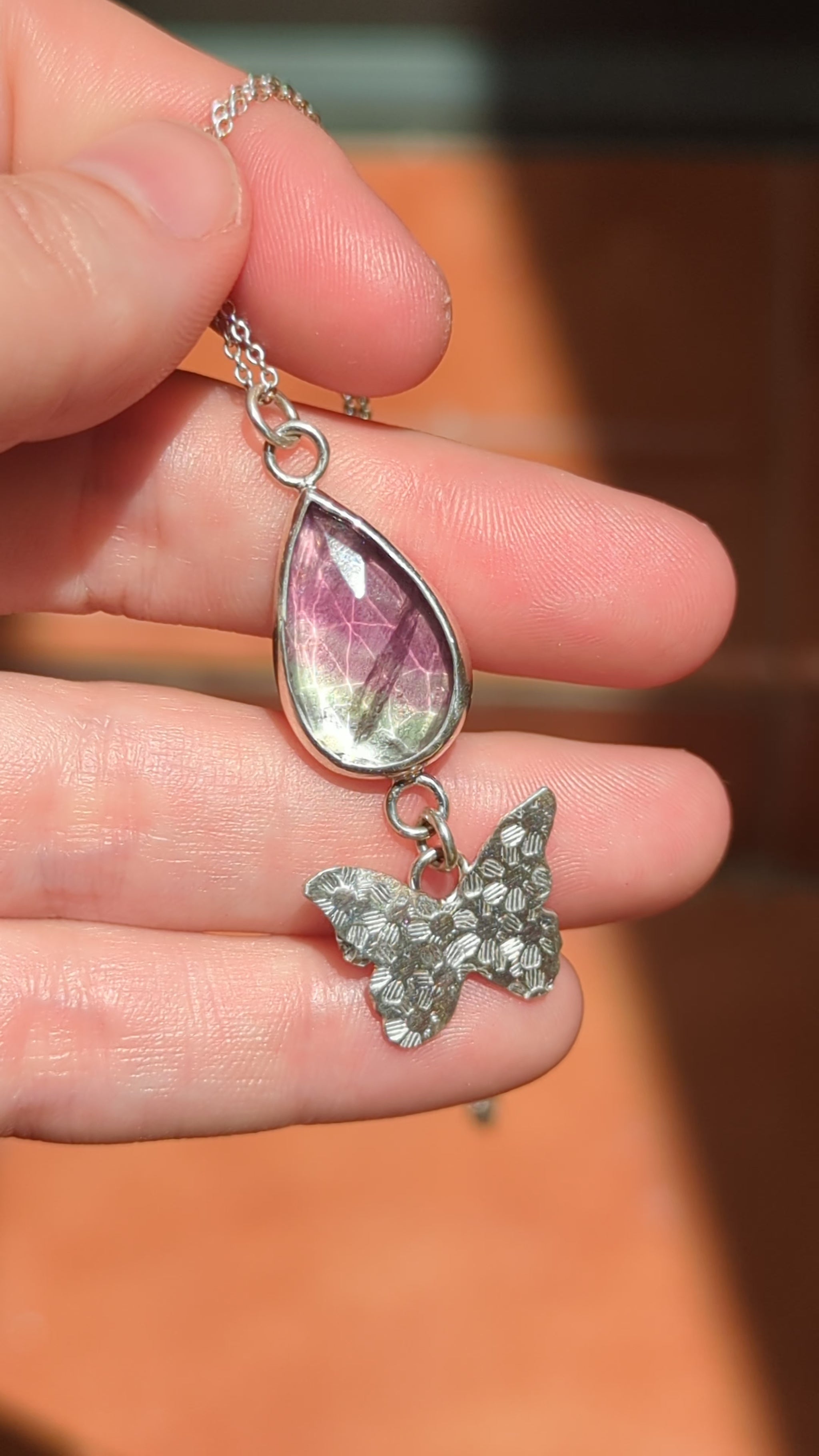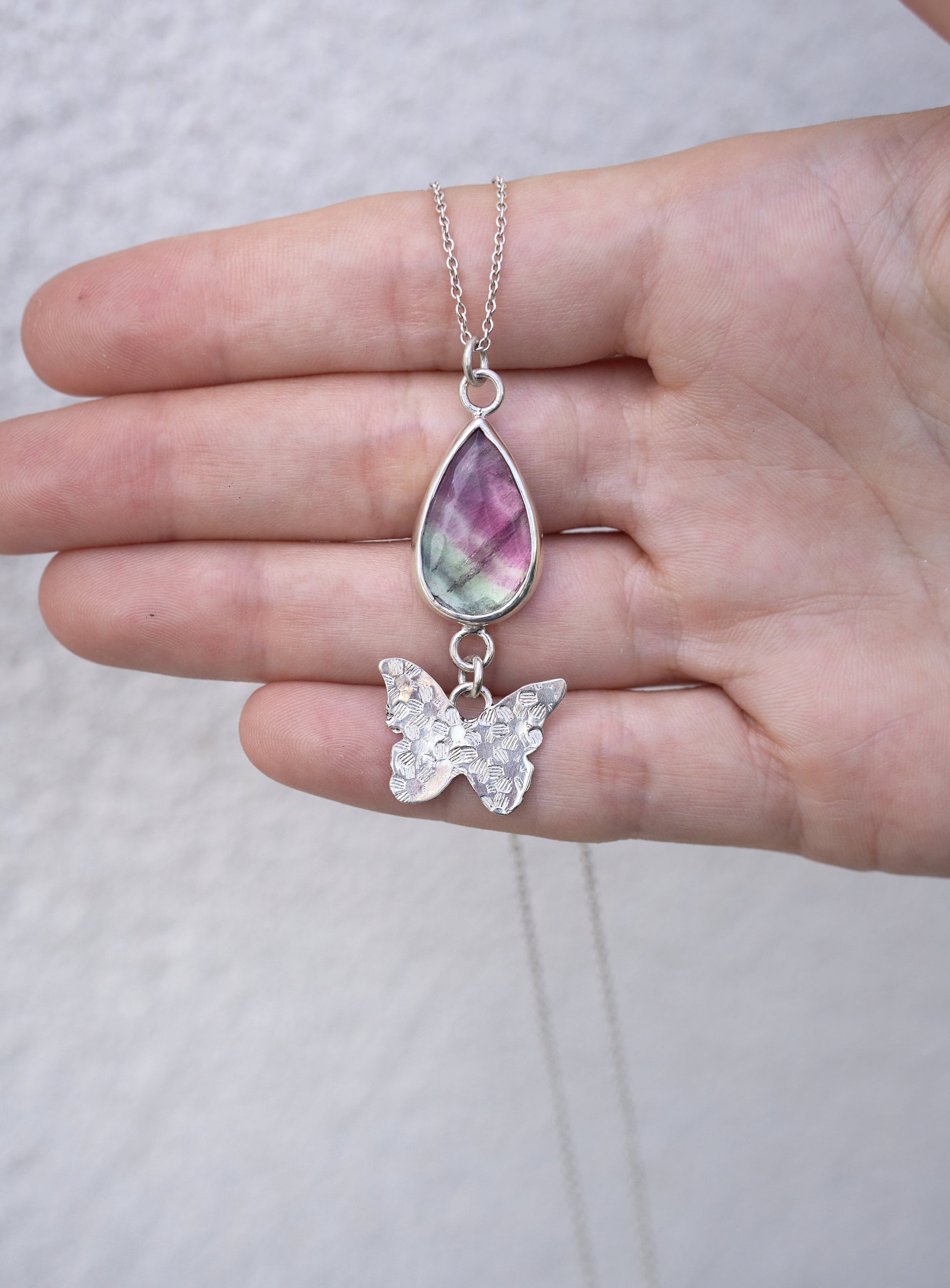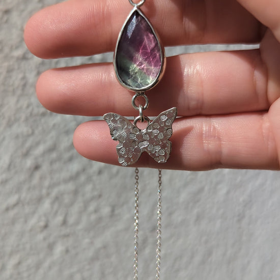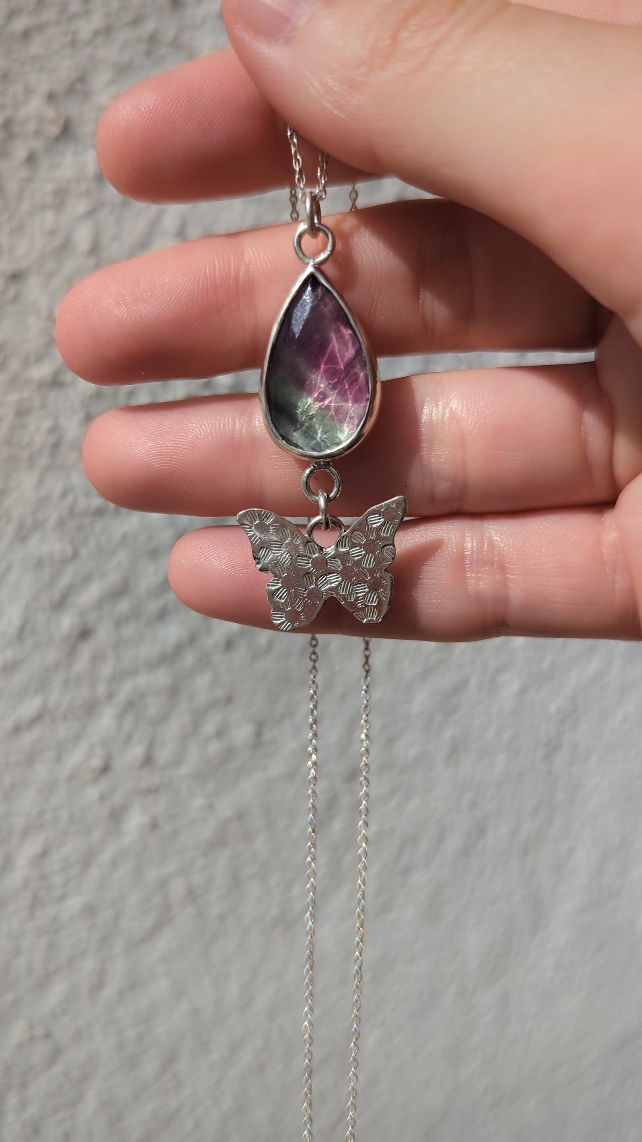Colgante hecho a mano de plata de ley 925 y fluorita en corte rosa.