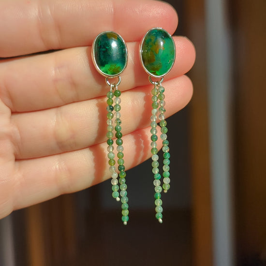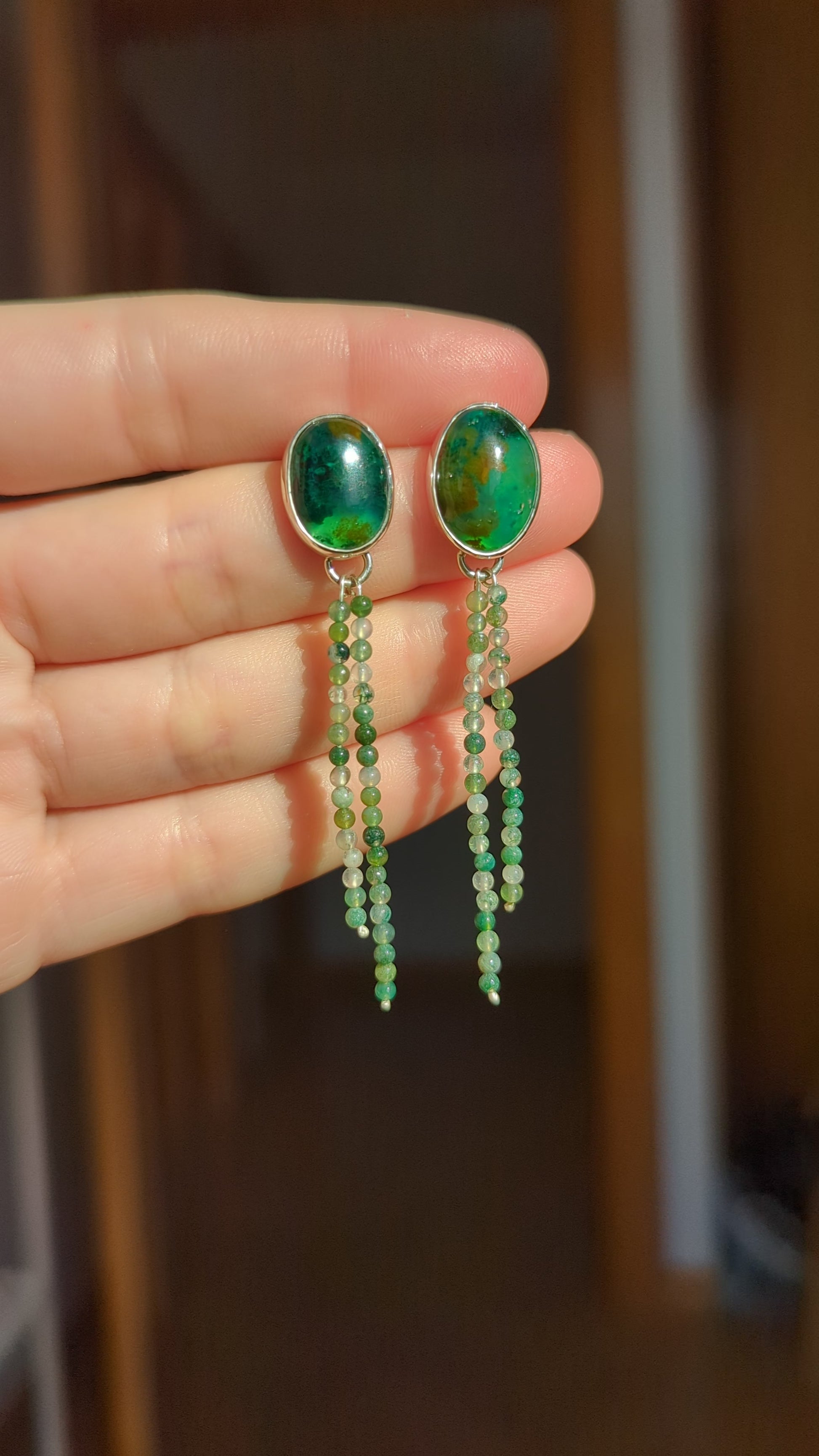 Pendientes hechos de plata de ley y gem silica peruana con bolitas de ágatas musgosas.