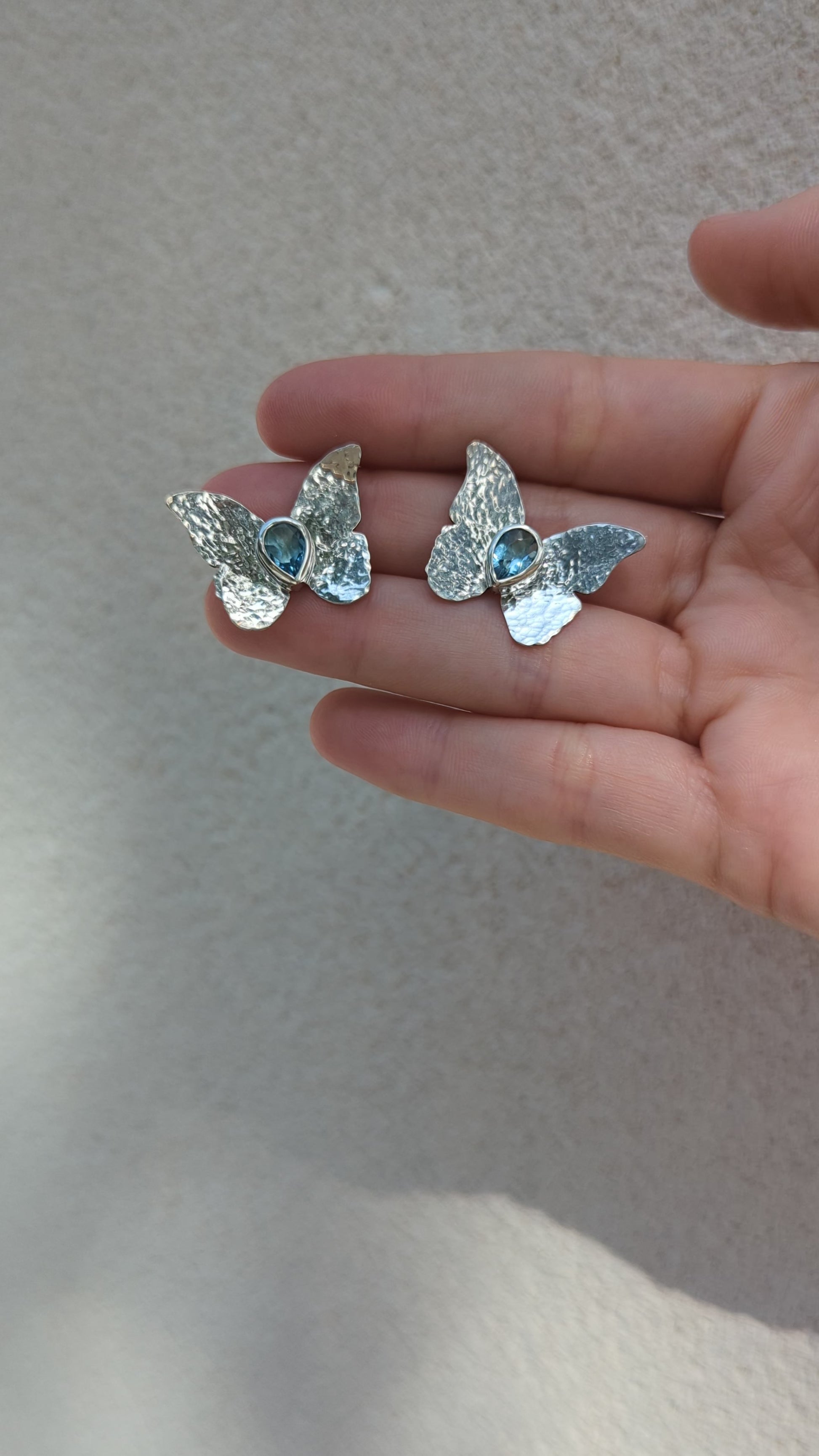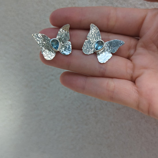 Si buscas elegancia estos pendientes son los tuyos. Las mariposas tiene textura martille y el color azul del topacio hace que recuerde al cielo o al mar.